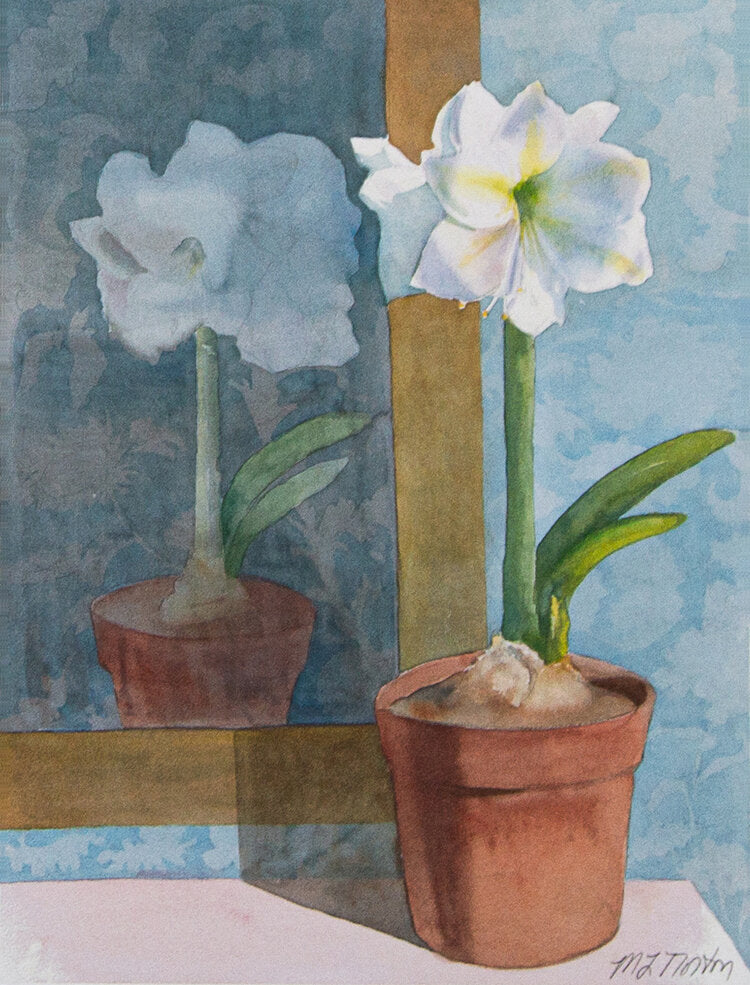 Beautiful watercolor Giclee print of original painting by Maine artist ML Norton. This elegant potted white amaryllis with mirror background is brought out by beautiful grays and blues, lending a sense of calm and serenity to any space.