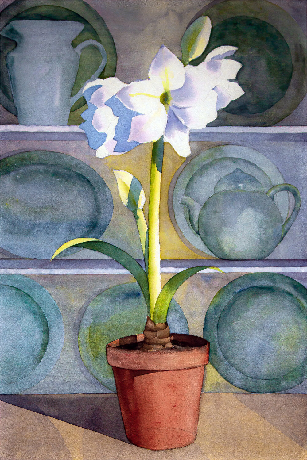 Beautiful watercolor Giclee print of original painting by Maine artist ML Norton. This elegant potted white amaryllis is brought out by beautiful grays and blues, lending a sense of calm and serenity to any space.